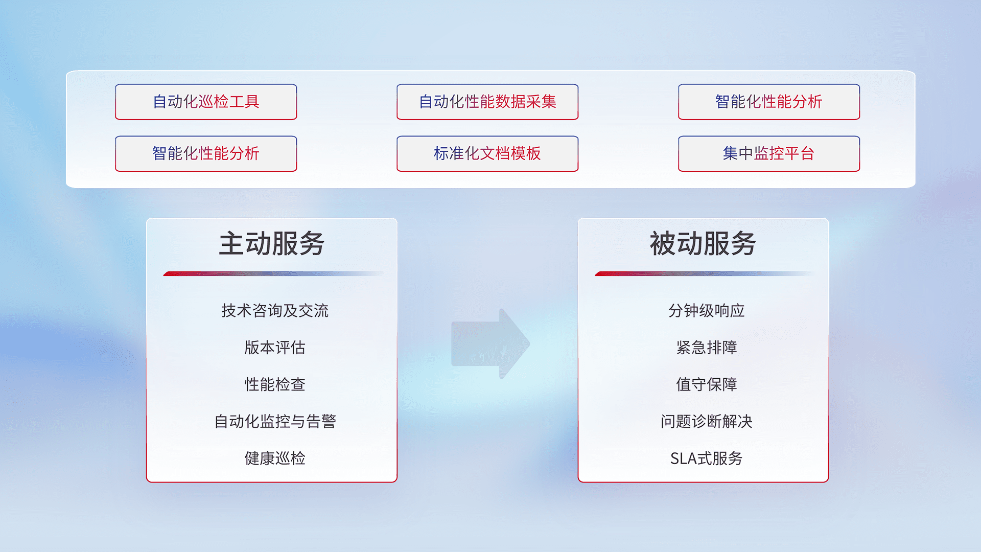 智能化工具和标准化文档,,,保障服务质量,,提供主动服务(包含技术咨询、、版本评估、、、、性能检查、、、、自动化监控与告警、、、健康巡检)和被动服务包含(分钟级响应、、、紧急排障、、、、值守保障、、问题诊断解决、、SLA服务)。。。