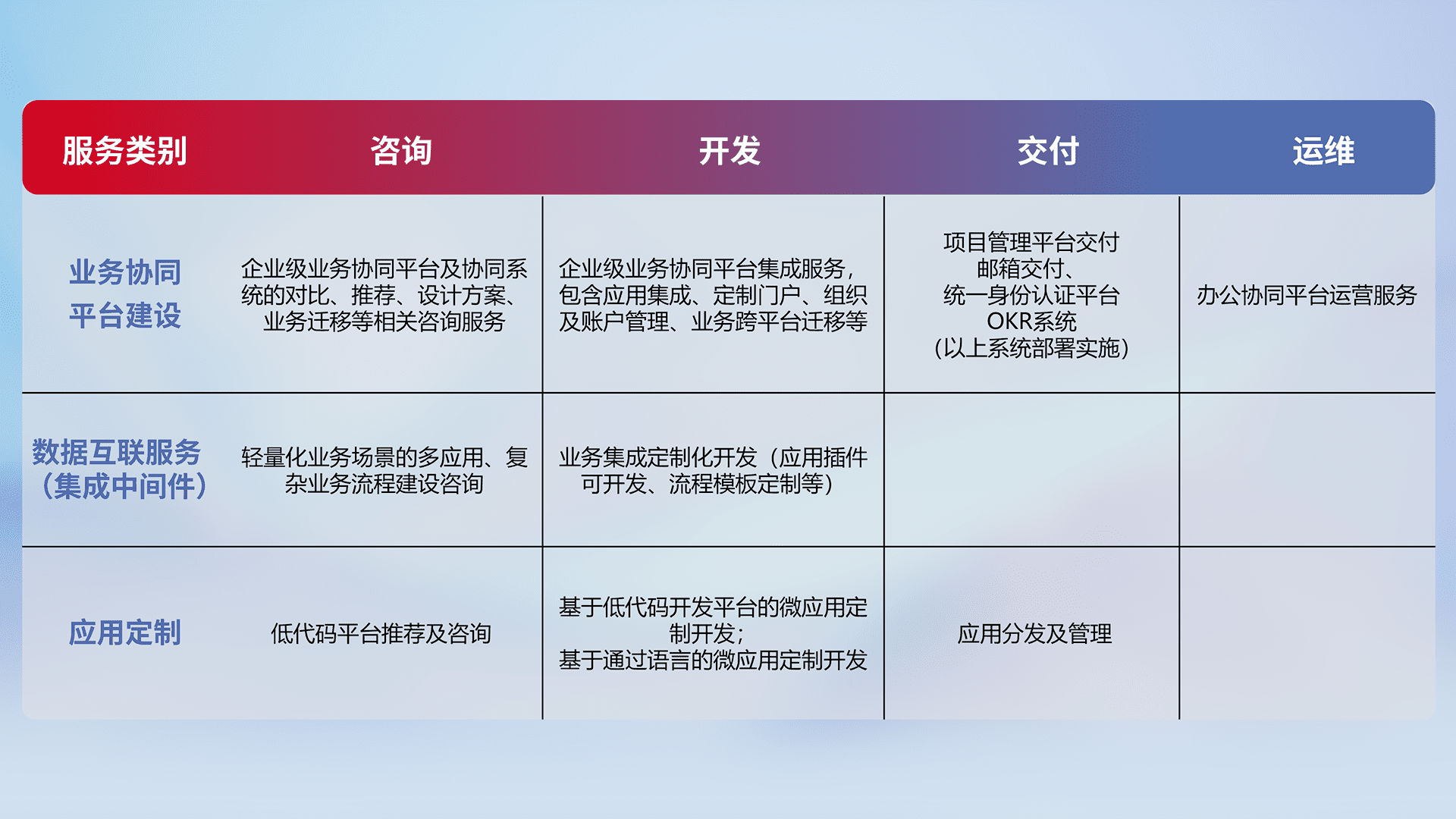 针对钉钉、、企微、、、IDaas等平台级产品提供产品的规划、、方案、、、交付、、定制化开发等服务,,实现如统一协同办公、、、智能客户服务、、混合会议管理、、、、智能数据查询、、、等业务场景,,,实现数字化转型。。。
